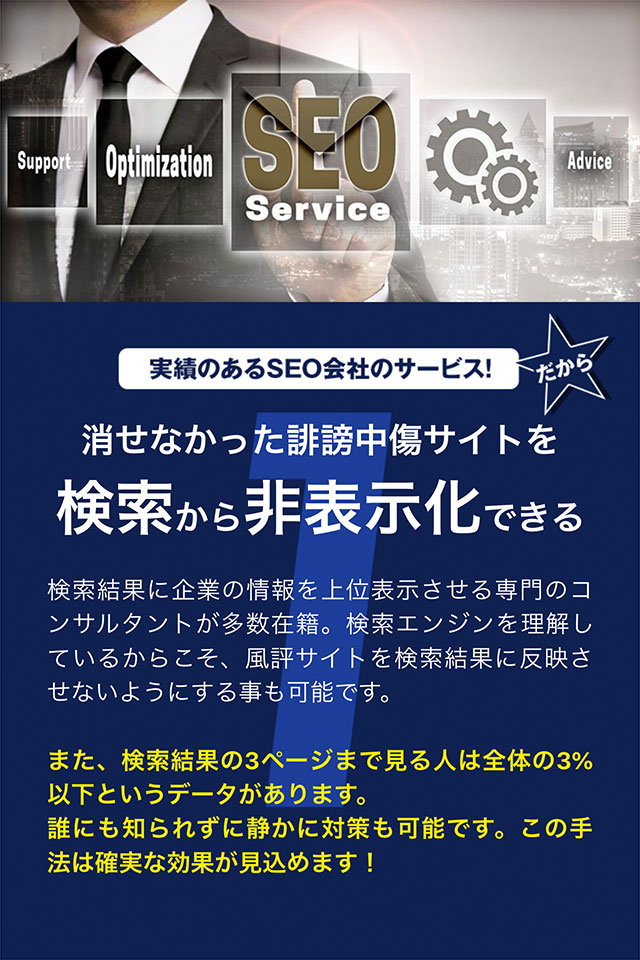 また、検索結果の3ページまで見る人は全体の3%以下というデータがあります。誰にも知られずに静かに対策も可能です。この手法は確実な効果が見込めます!